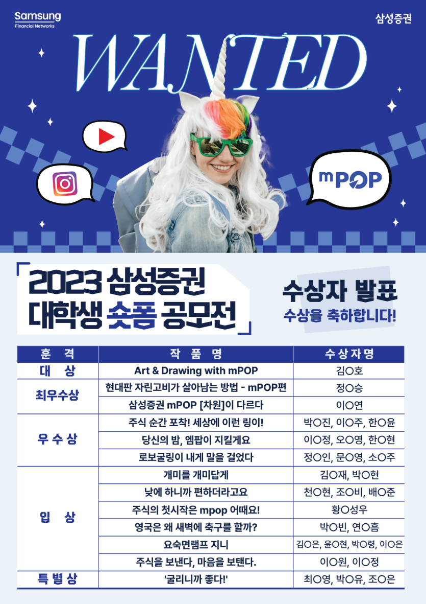 참여해주신 모든 분들께 감사드리며 삼성증권 대학생 숏폼 공모전의 수상자를 아래와 같이 발표합니다.
