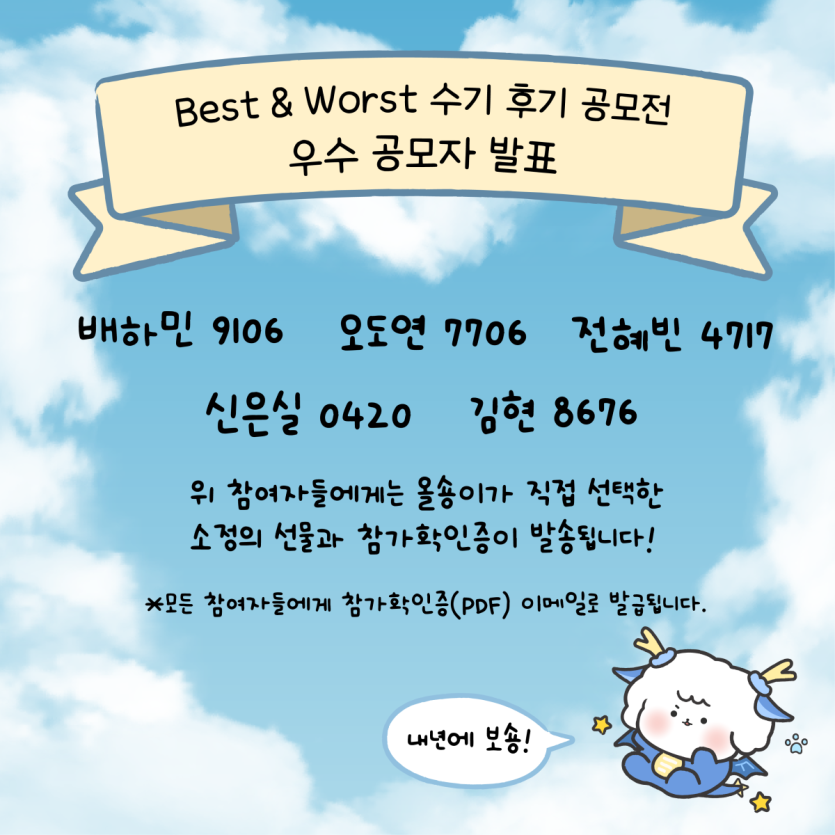 Best & Worst 우수 공모자 발표 페이지 정보 작성자 올콘관리자 댓글 0건 조회 3,141회 작성일 24-01-08 10:25 목록 본문 페이스북 공유 트위터 공유 구글+ 공유 카카오톡 공유 댓글 0 댓글목록 등록된 댓글이 없습니다.