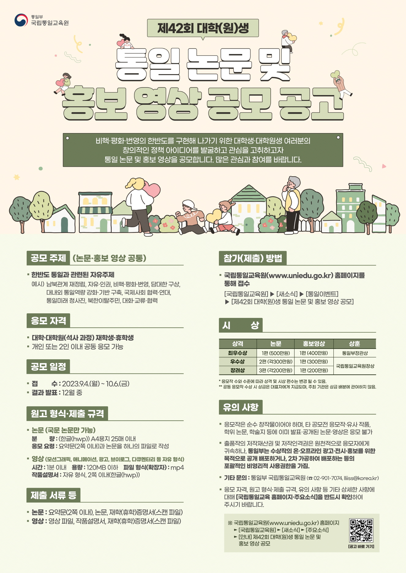 - 제42회 대학(원)생 통일 논문 및 홍보 영상 공모를 개최합니다.