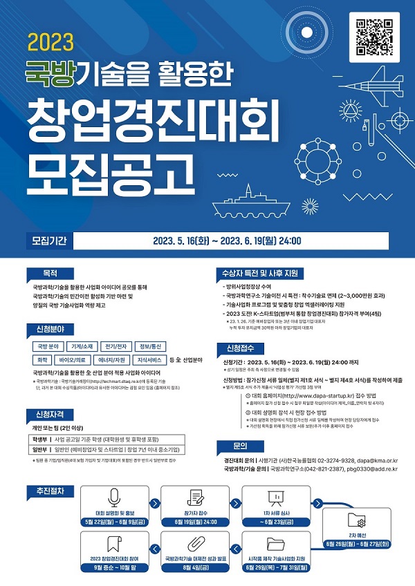 - 창업경진대회 및 국방기술 설명회 : 5월 22일(월) ∼ 6월 9일(금)