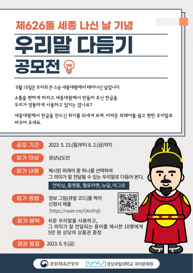 - 세종 나신 날 기념 우리말 다듬기 공모전을 개최합니다.