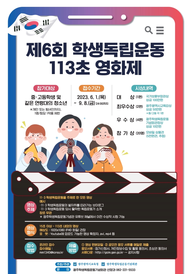 첨부파일 다운로드2023년제6회학생독립운동113초영화제공고문.pdf