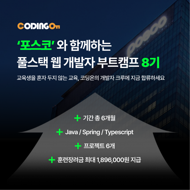 - 포스코 x 코딩온 풀스택 웹 개발자 양성  8기를 모집 합니다.