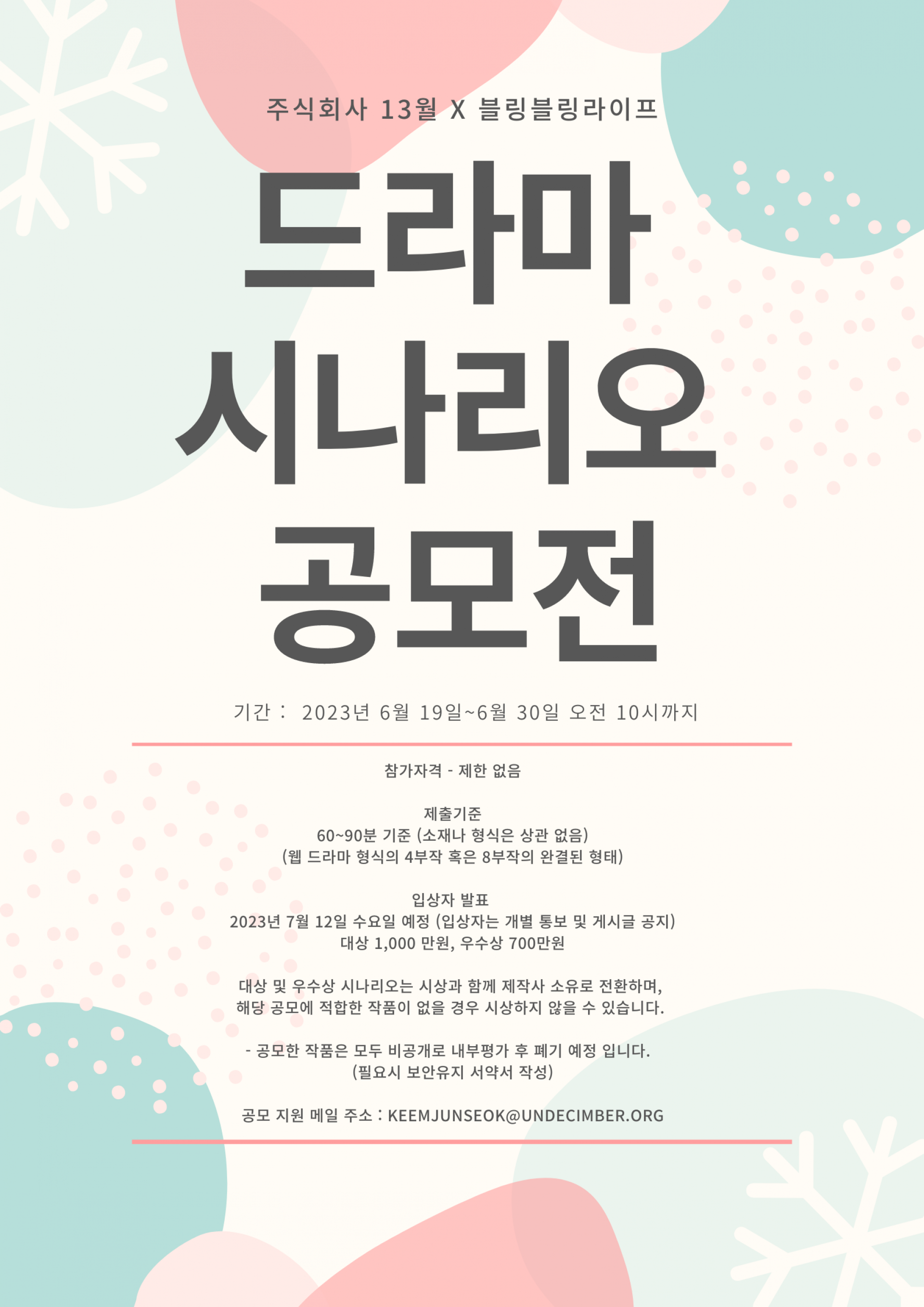 - 주식회사 13월에서 웹드라마 시나리오 공모전을 개최합니다.