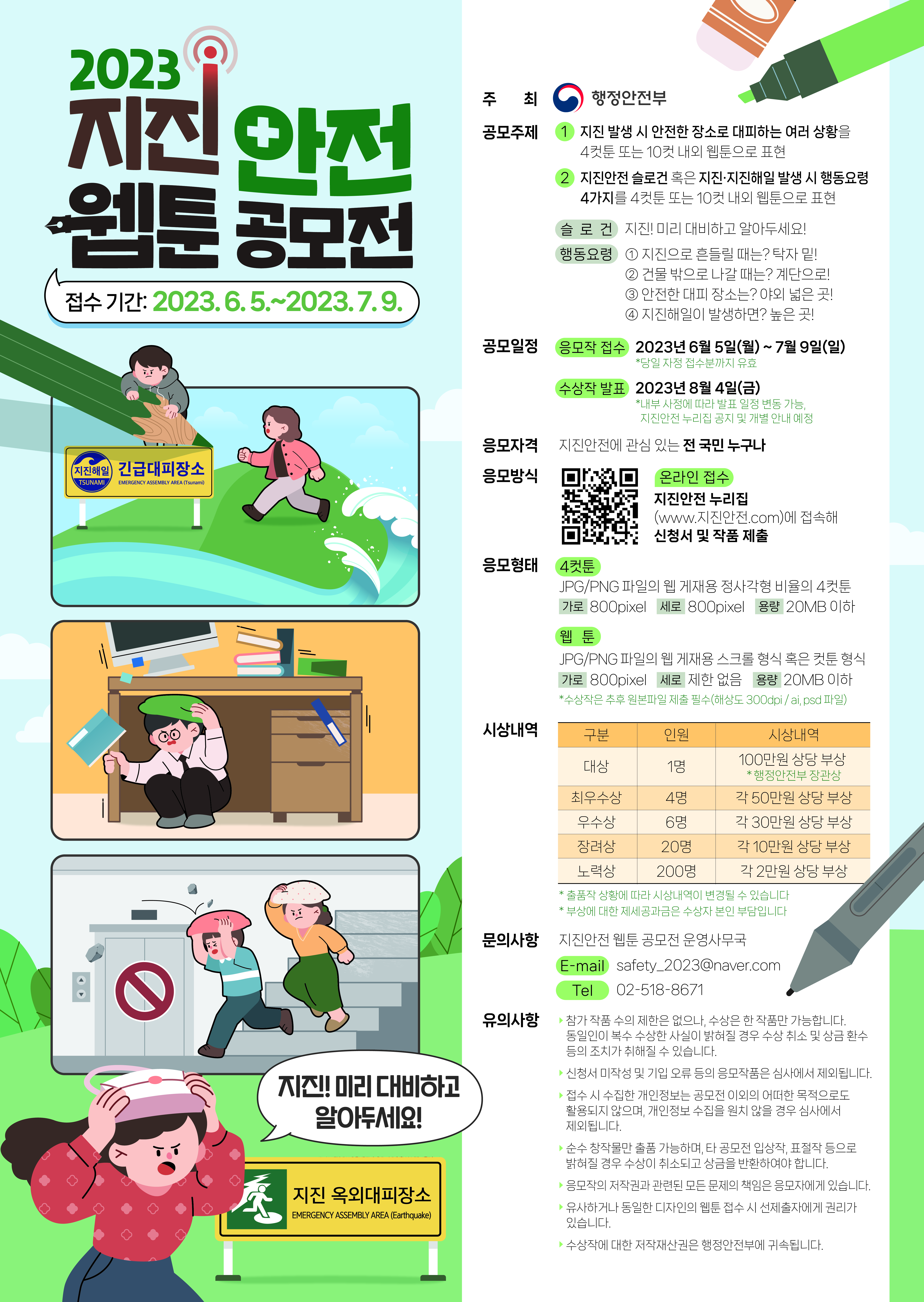 - 행정안전부에서 지진안전 웹툰 공모전을 개최합니다.