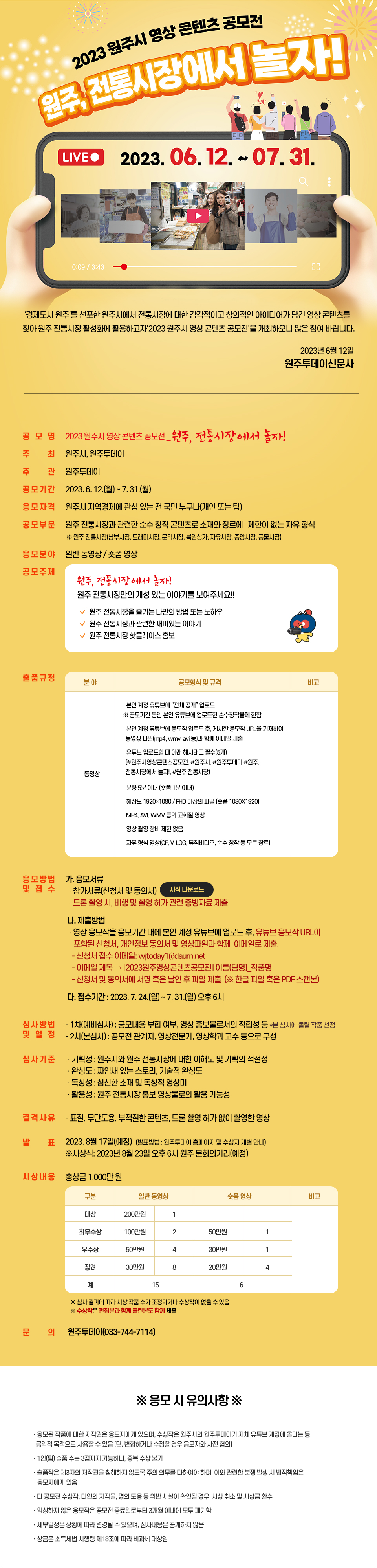 - 2023 원주시 영상 콘텐츠 공모전을 개최합니다.