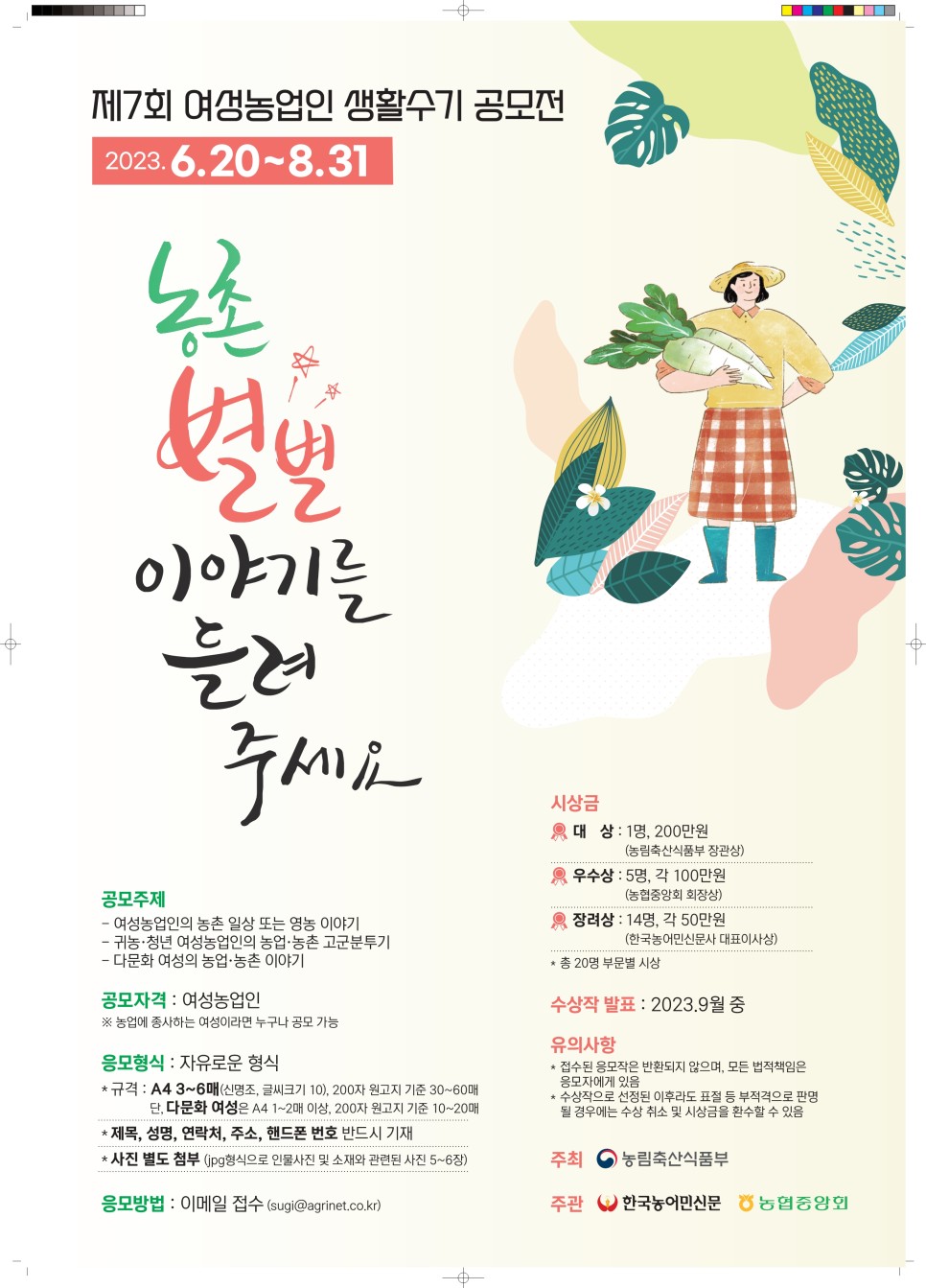 - 제7회 여성농업인 생활수기 공모전을 개최합니다.