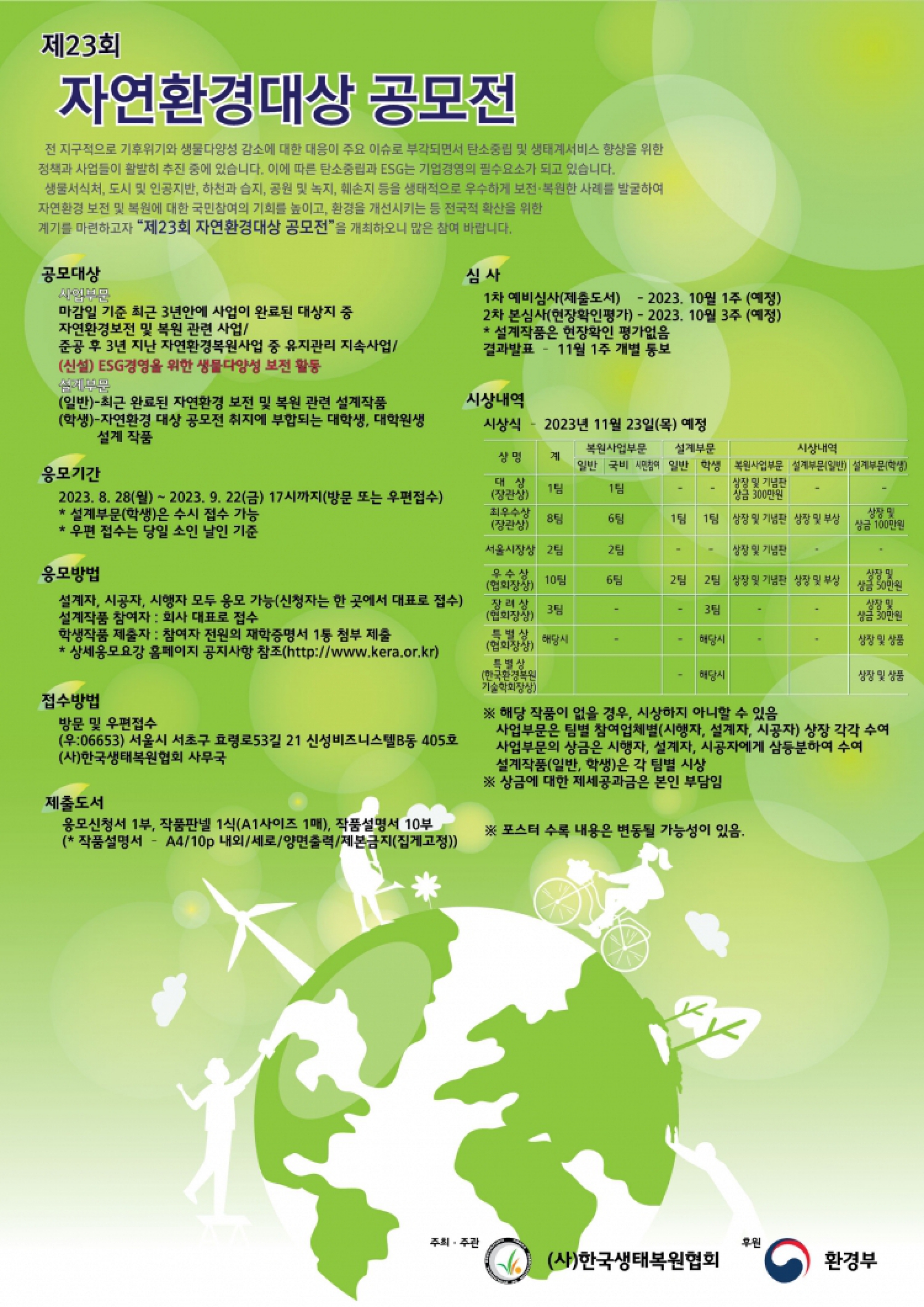 계기를 마련하고자 “제23회 자연환경대상 공모전”을 개최하오니