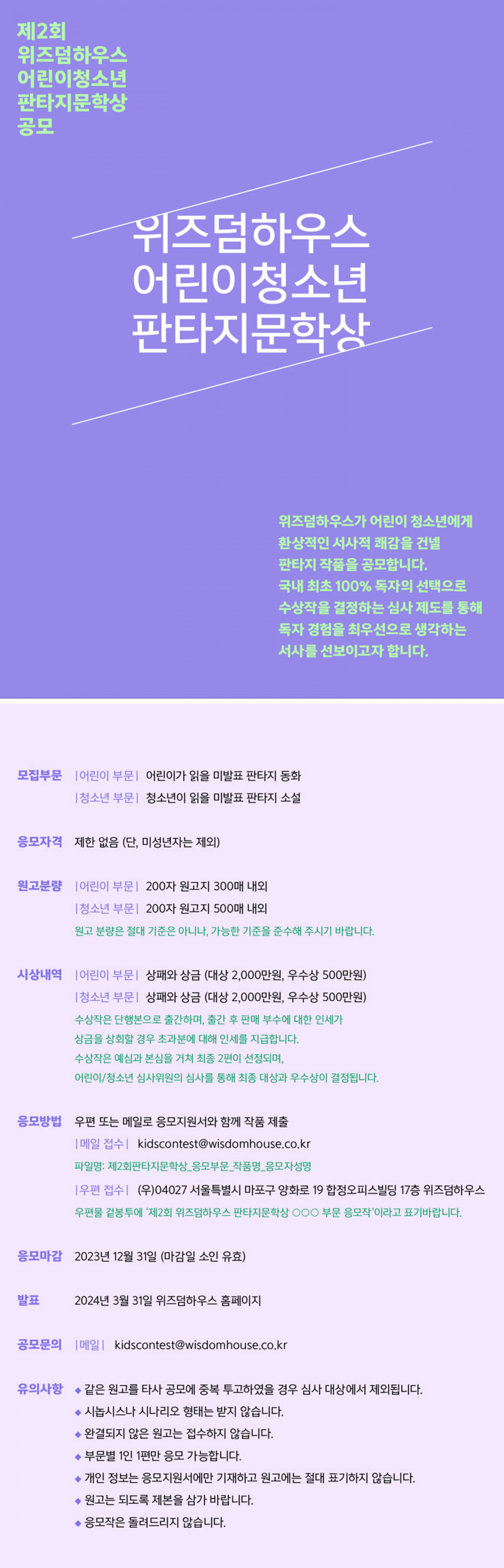 - 제2회 위즈덤하우스 어린이청소년 판타지문학상 공모전을 개최합니다.