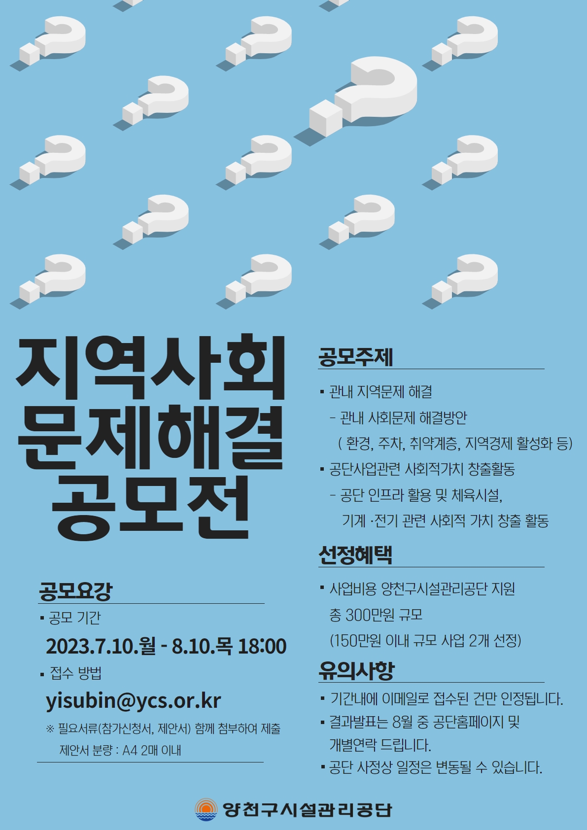 - 양천구시설관리공단이 2023 지역문제해결 사업 공모전을 개최하오니