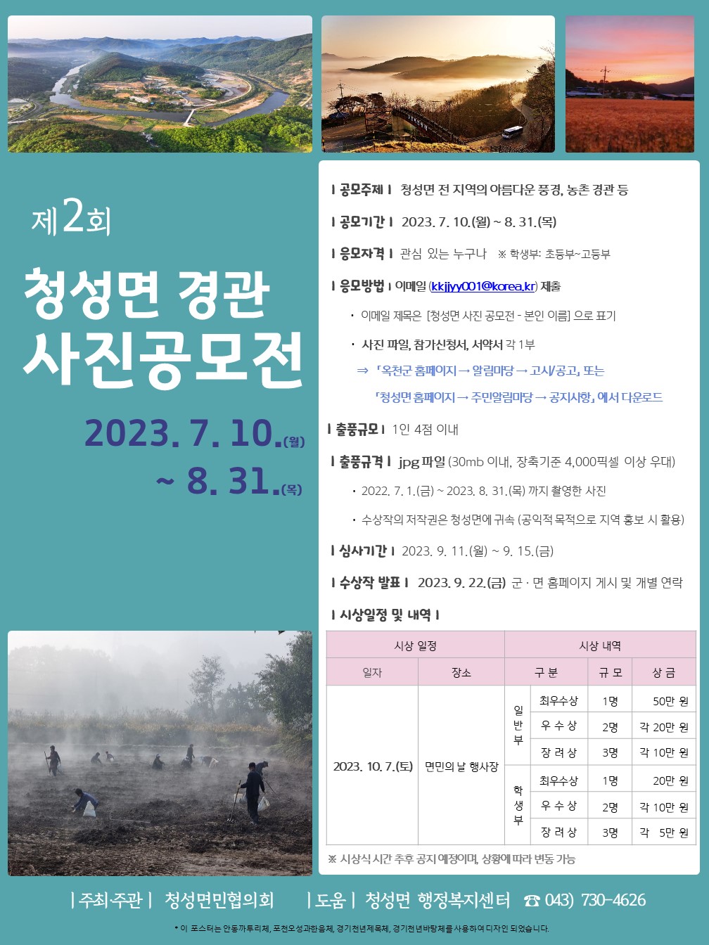 - 제2회 청성면 경관 사진 공모전을 개최하오니