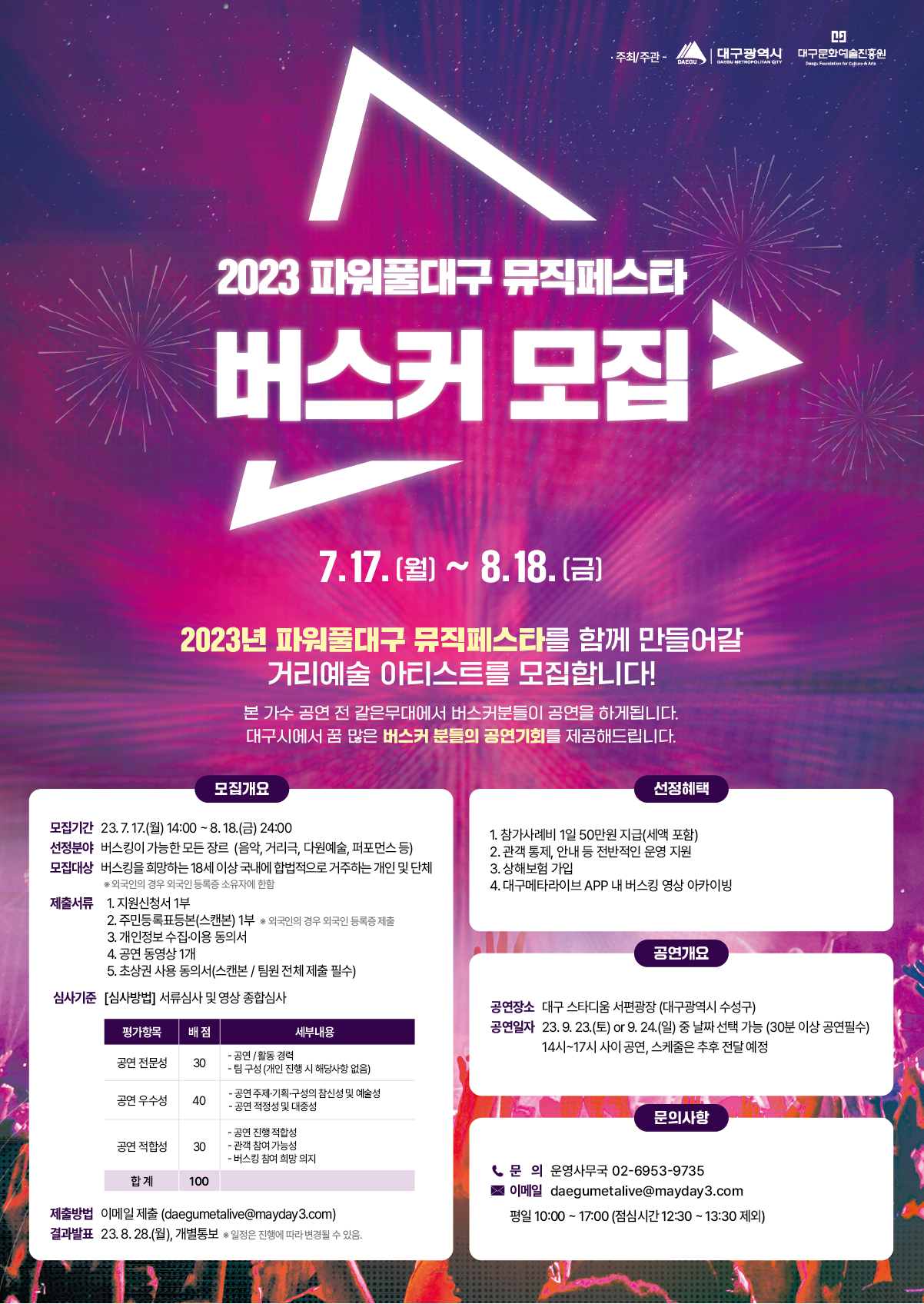 - 이메일 제목 : 2023 파워풀대구 뮤직페스타 버스커 지원_단체명