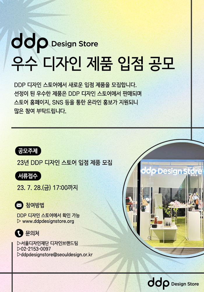 - 서울디자인재단의 DDP디자인스토어에서 2023년도 새로운 입점 제품을 모집합니다.