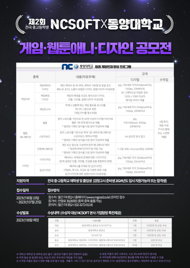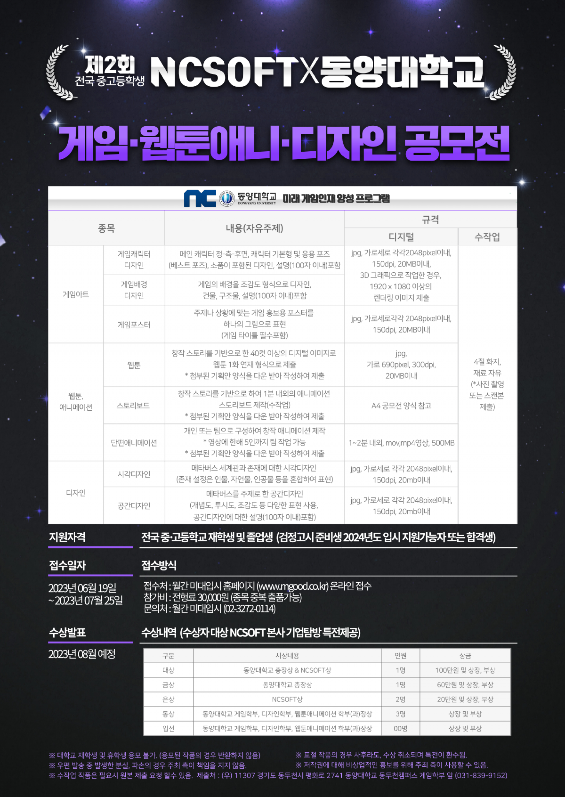 - 동양대학교와 NCSOFT에서 게임아트·웹툰애니·디자인 공모전을 개최하오니