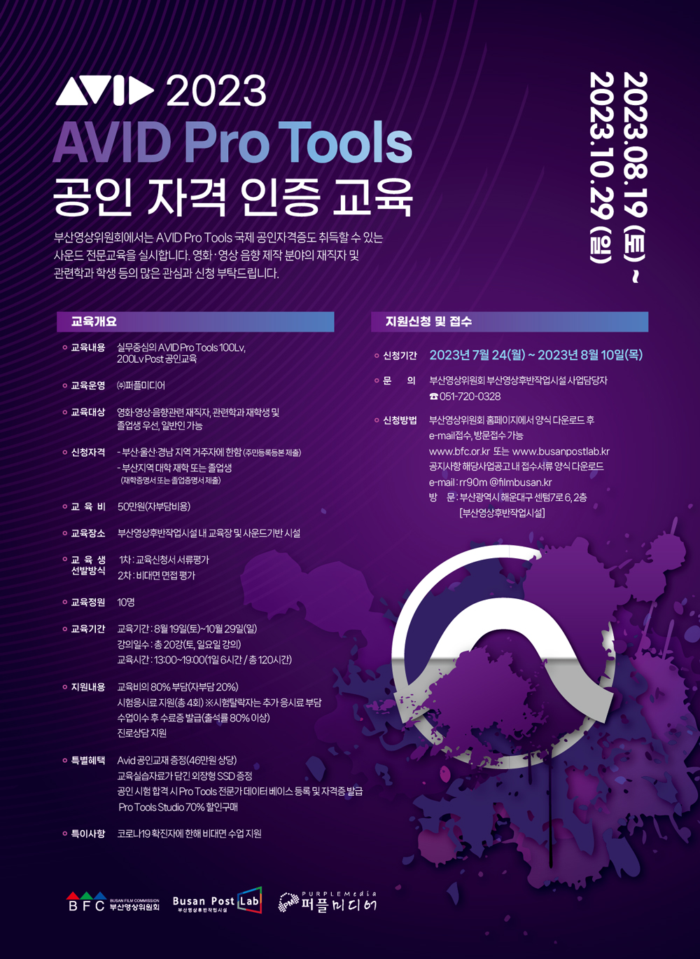 - 2023 'AVID Pro Tools 공인 자격 인증 교육'의 교육생을 모집하오니