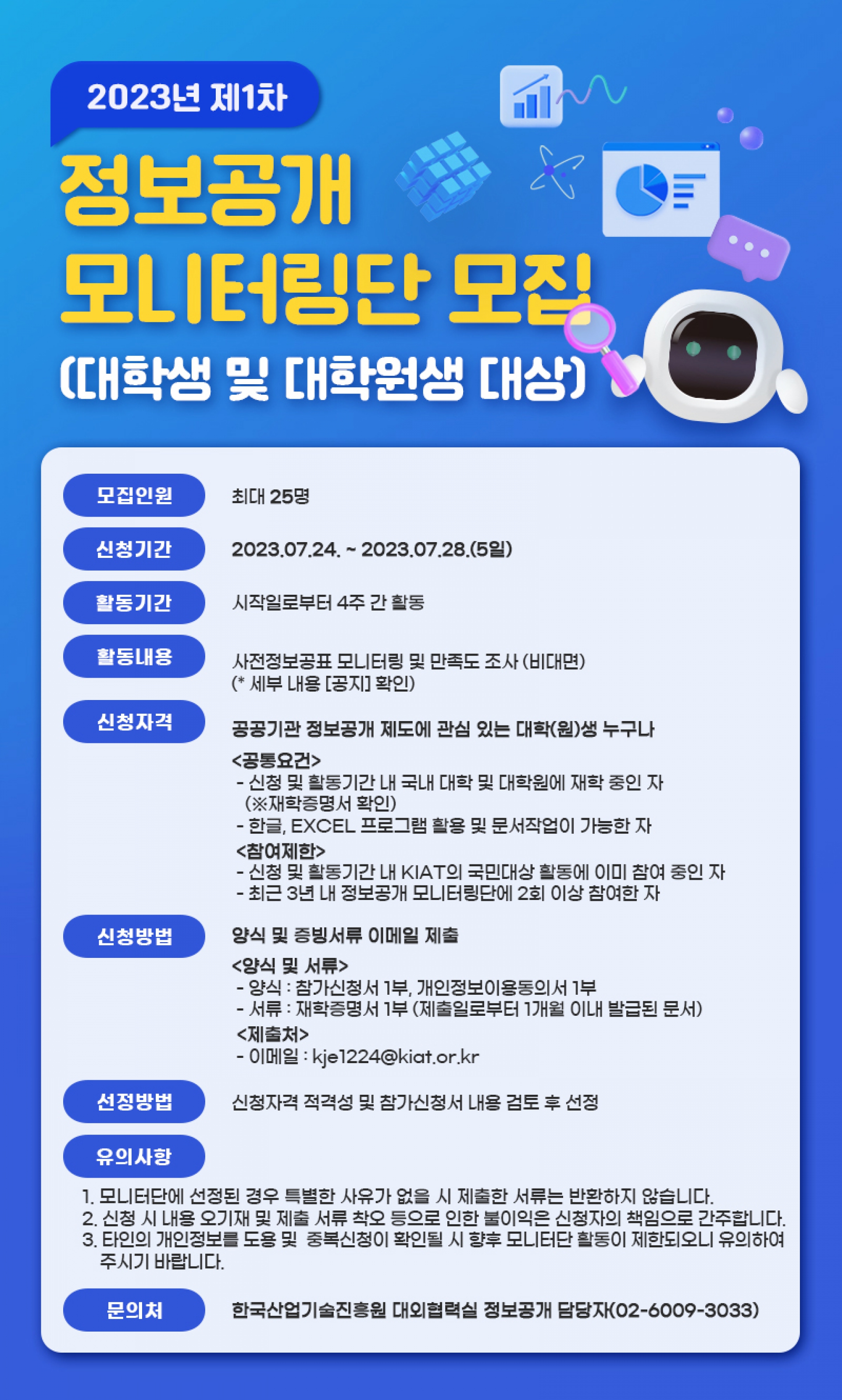 - 2023년 제1차 한국산업기술진흥원 정보공개 모니터단을 모집하오니