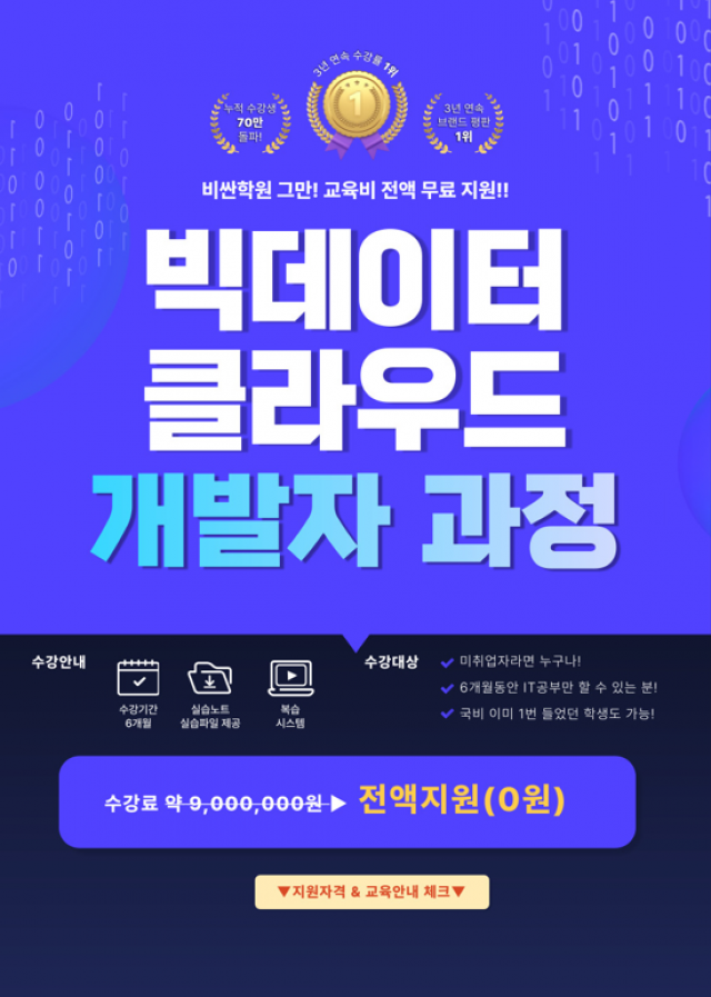 - 빅데이터&머신러닝&AI&개발자 무료 국비지원 참여자를 모집합니다.