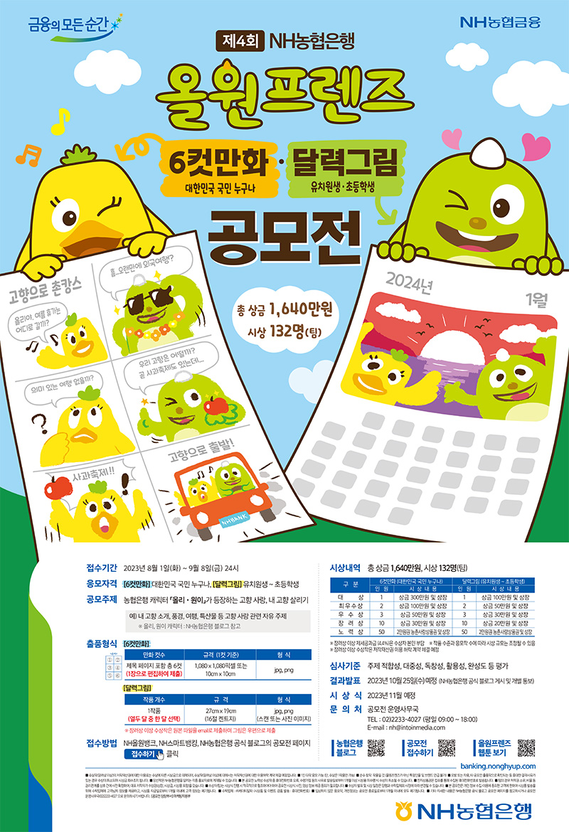 - 제4회 NH농협은행 올원프렌즈 6컷만화·달력그림 공모전을 개최하오니