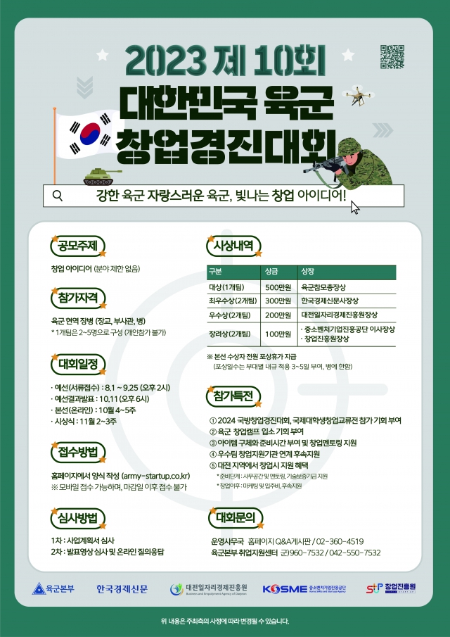 ‘23년 제 10회 육군 창업경진대회를 개최 하오니 많은 장병들의 참여를 바랍니다.