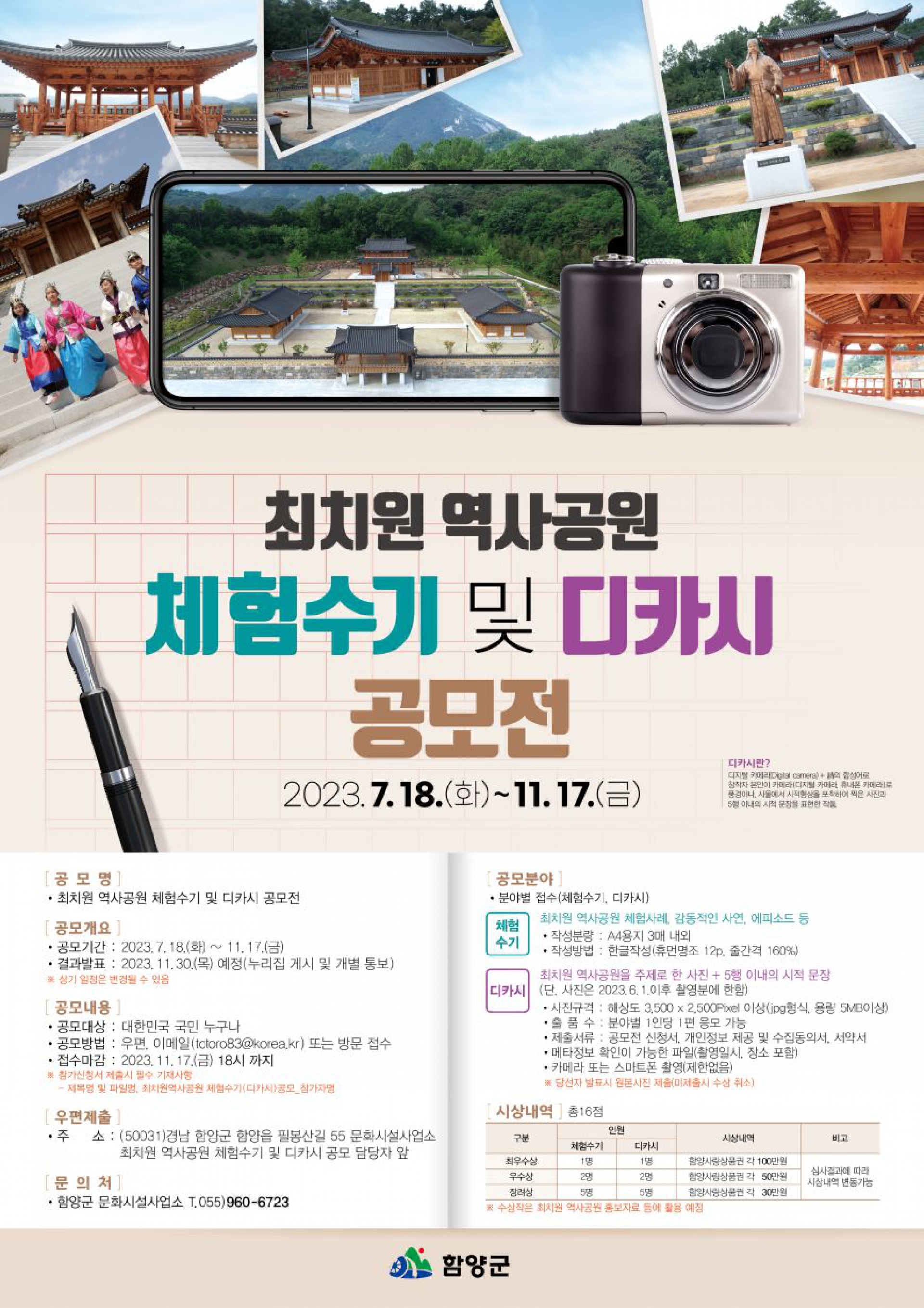 - 최치원 역사공원 체험수기 및 디카시 공모전을 개최하오니