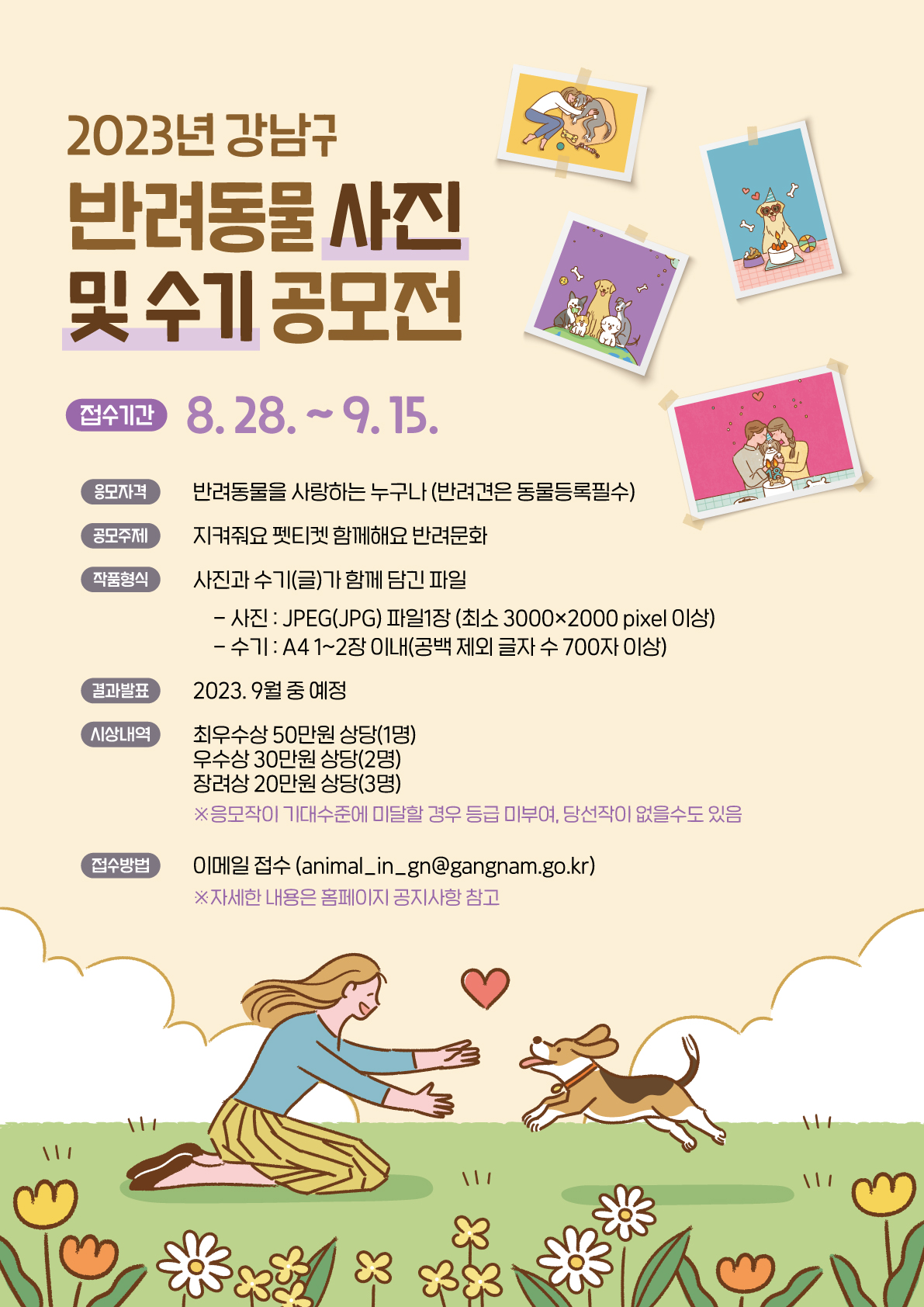 - 2023년 강남구 반려동물 사진 및 수기 공모전을 개최하오니