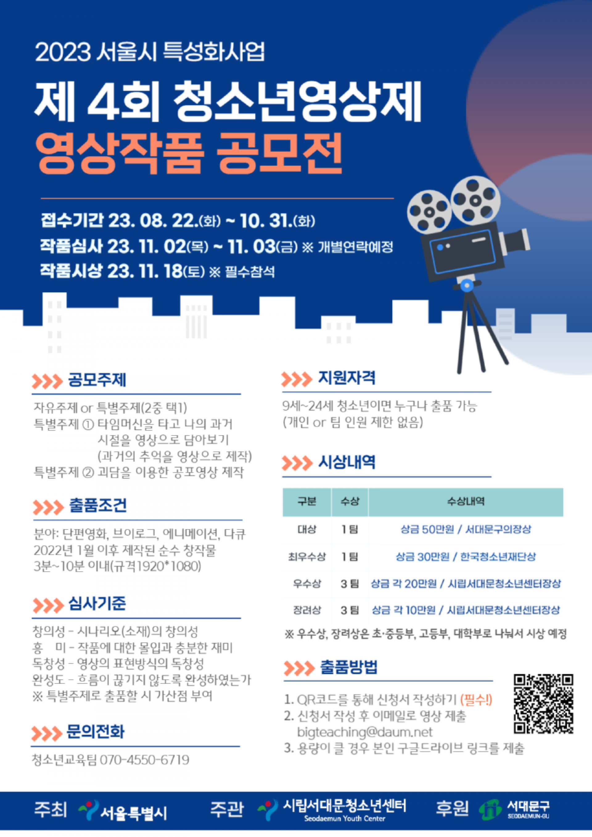 - 우수상 3팀 : 각 20만원, 시립서대문청소년센터장상