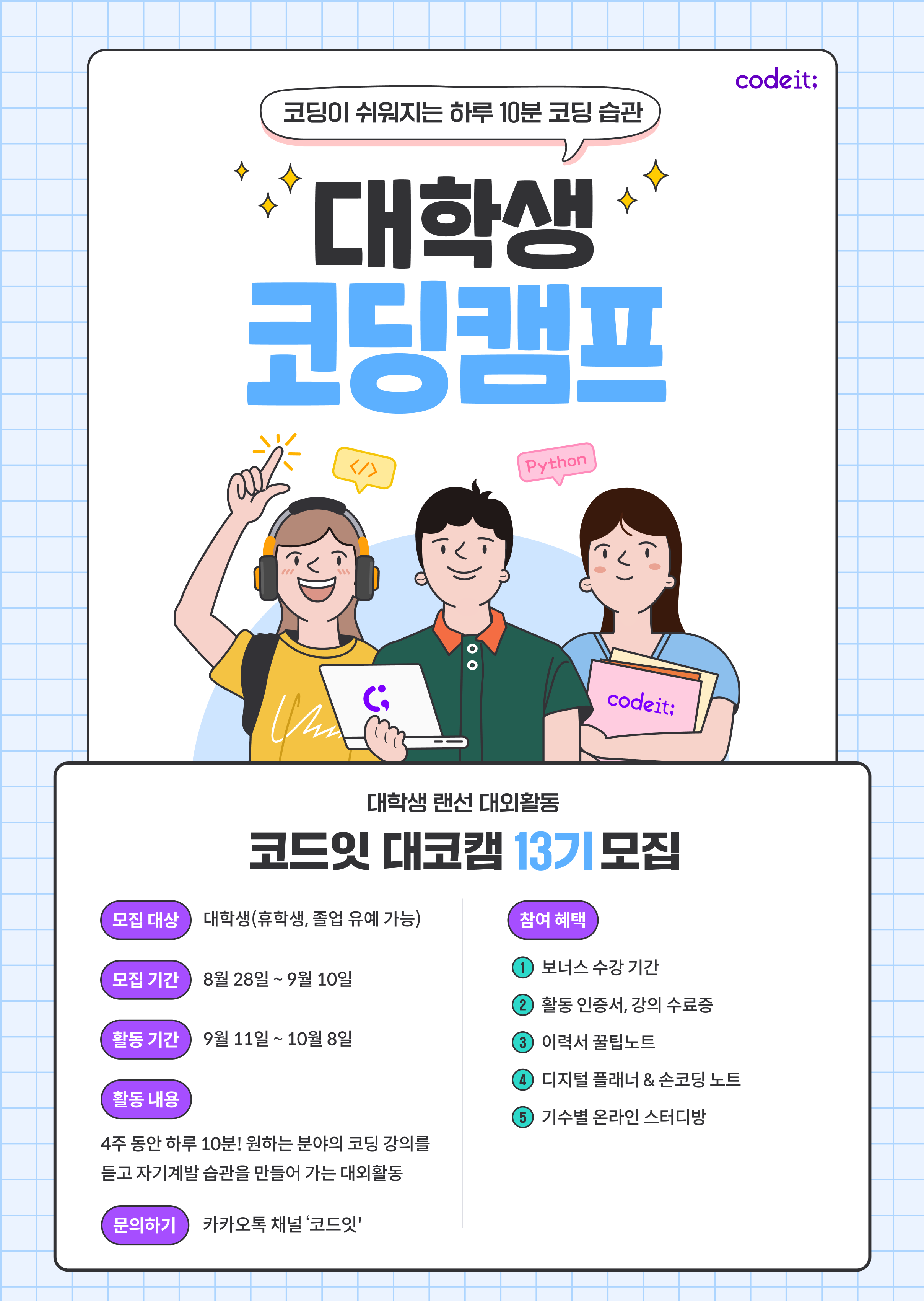 - 하루 10분 공부 습관 만들고, 코딩 역량 갖출 대학생 여러분을 찾습니다!