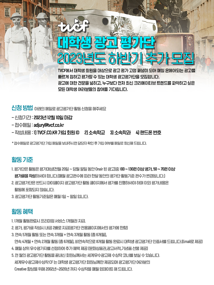 - 2023년도 하반기 TVCF 대학생 광고평가단을 모집하오니