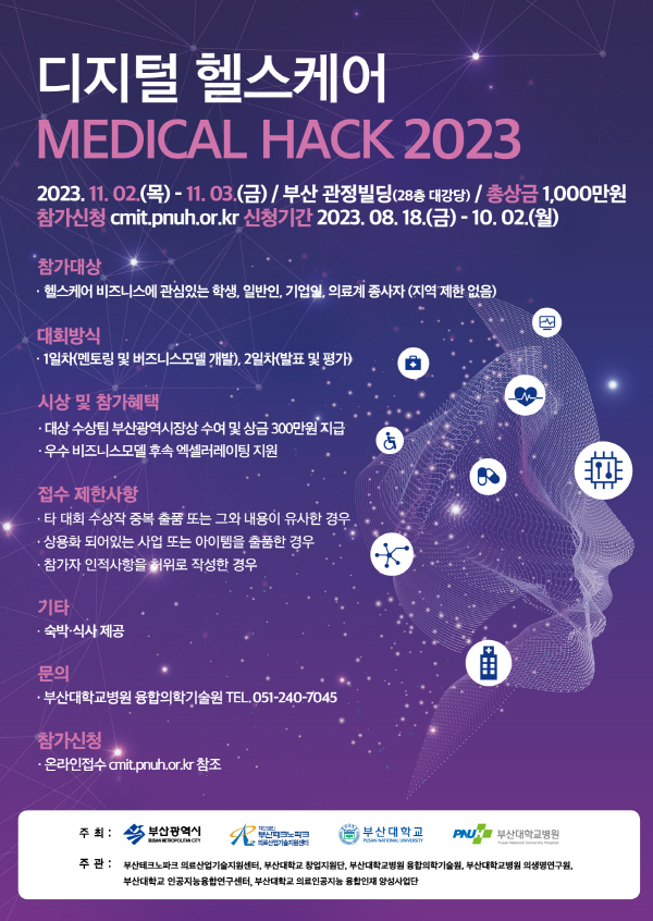 | 주관 | 부산테크노파크 의료산업기술지원센터, 부산대학교 창업지원단, 부산대학교병원 융합의학기술원, 부산대학교병원 의생명연구원, 부산대학교 인공지능융합연구센터, 부산대학교 의료인공지능 융합인재 양성사업단 |