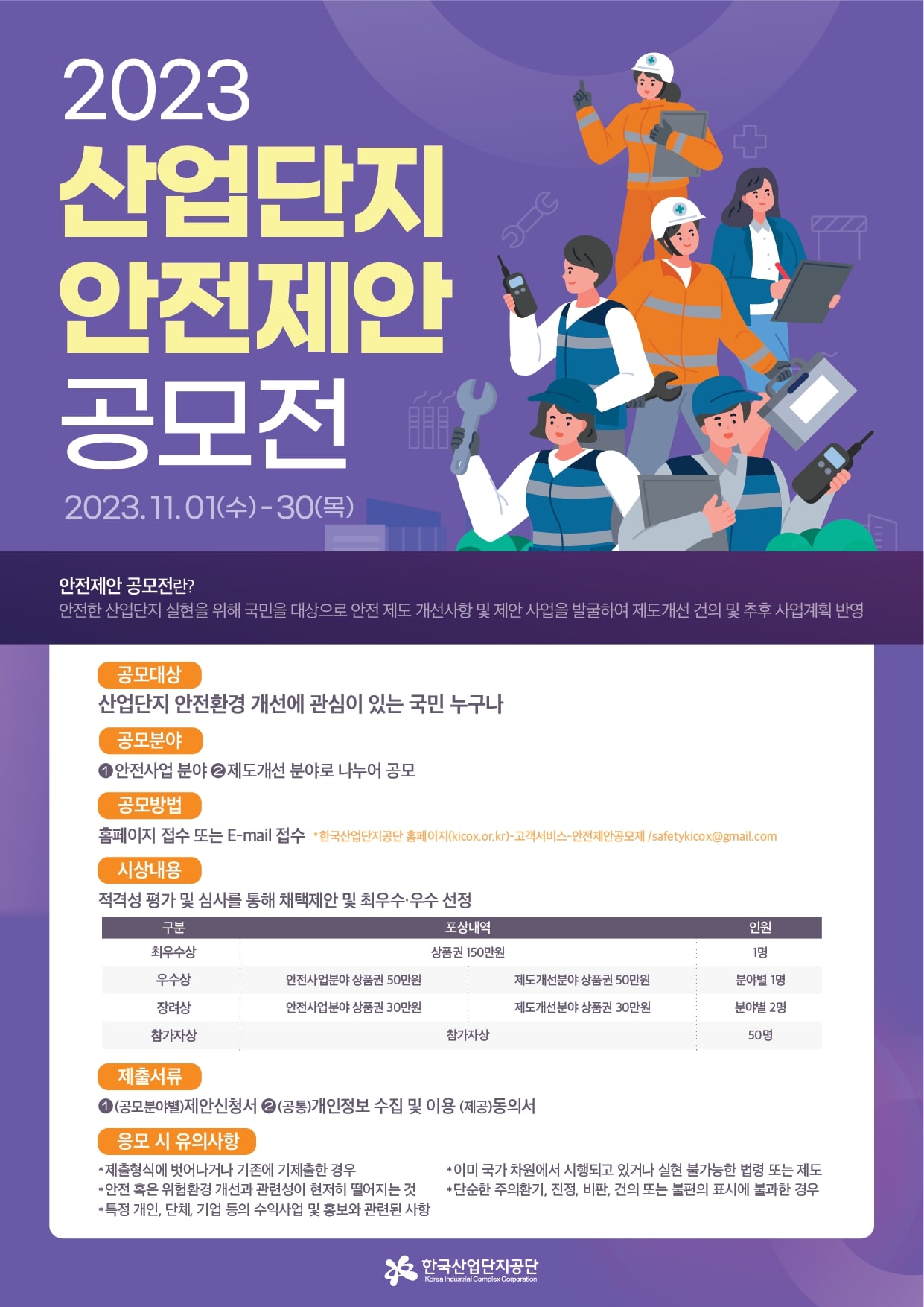 - 한국산업단지공단에서 <2023 산업단지 안전제안 공모전>을 개최하오니