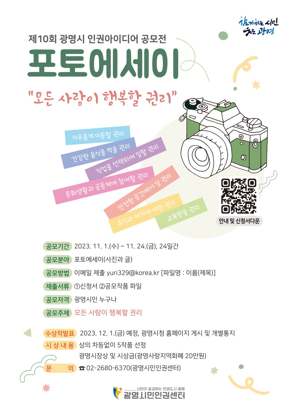 - 제10회 광명시 인권아이디어 공모전(포토에세이)를 개최하오니