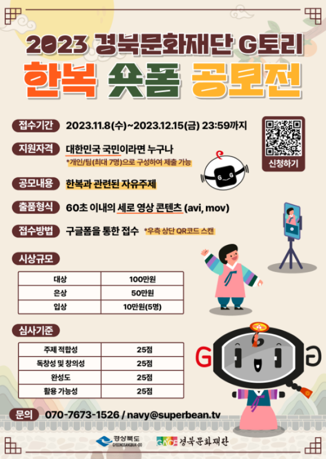 - 2023 경북문화재단 G토리 한복 숏폼 공모전을 개최하오니