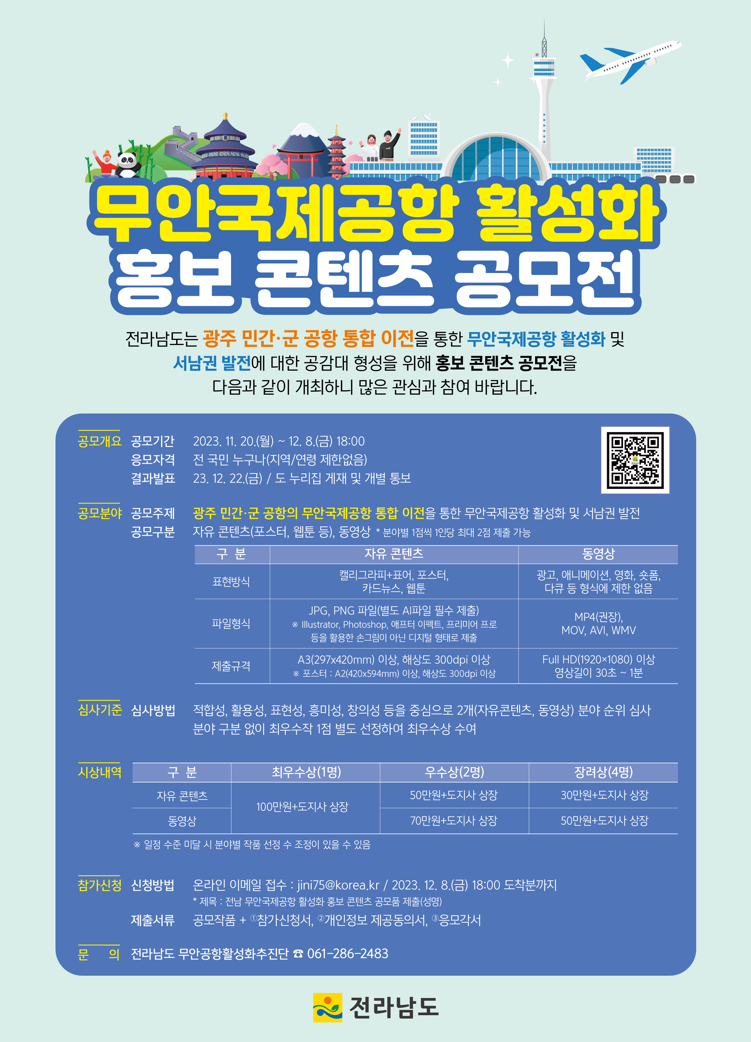 - 무안국제공항 활성화 홍보 콘텐츠 공모전을 개최하오니