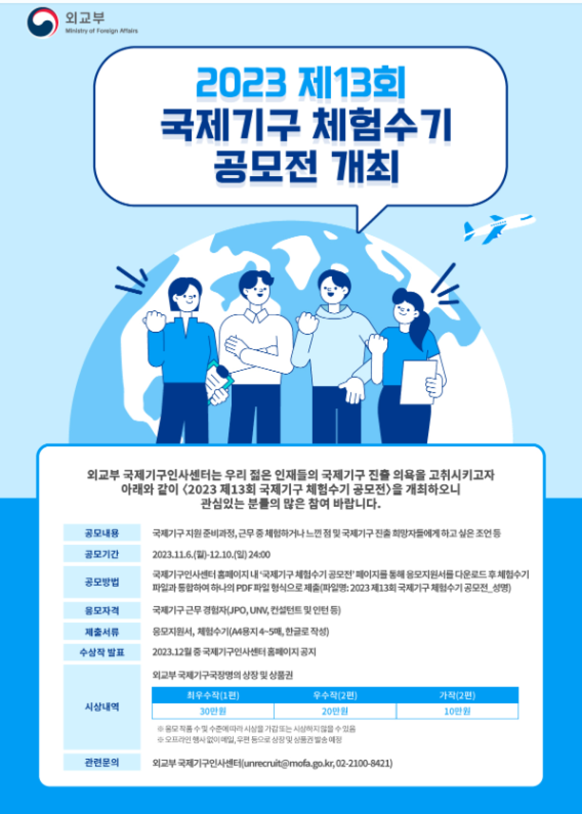- 외교부에서 2023 제13회 국제기구 체험수기 공모전을 개최하오니