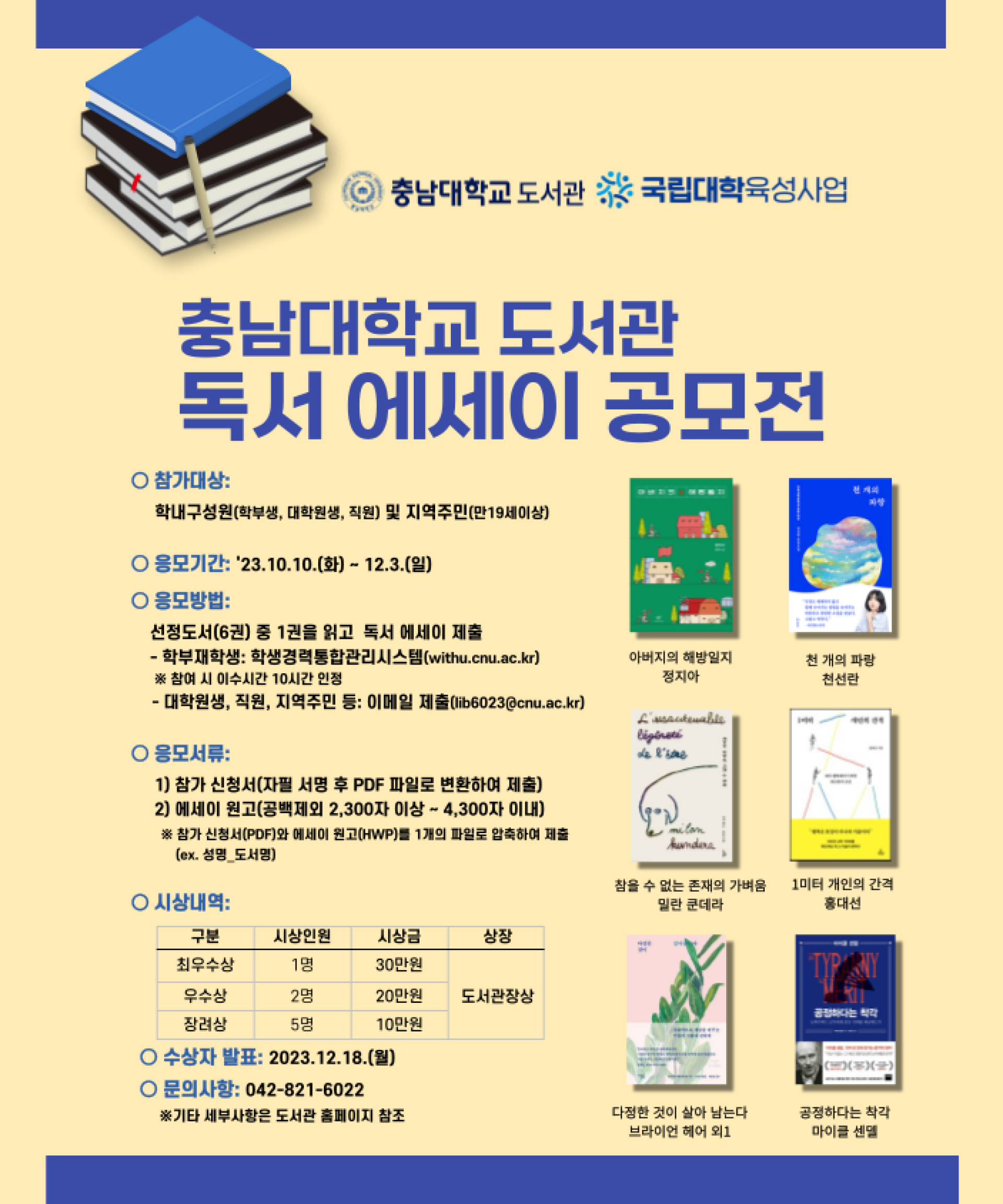 - 충남대학교 도서관에서 독서 에세이 공모전을 개최하오니