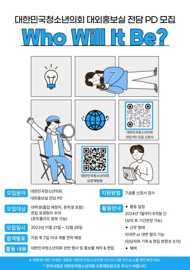 - 대한민국청소년의회 대외홍보실 전담 PD님을 모집합니다.