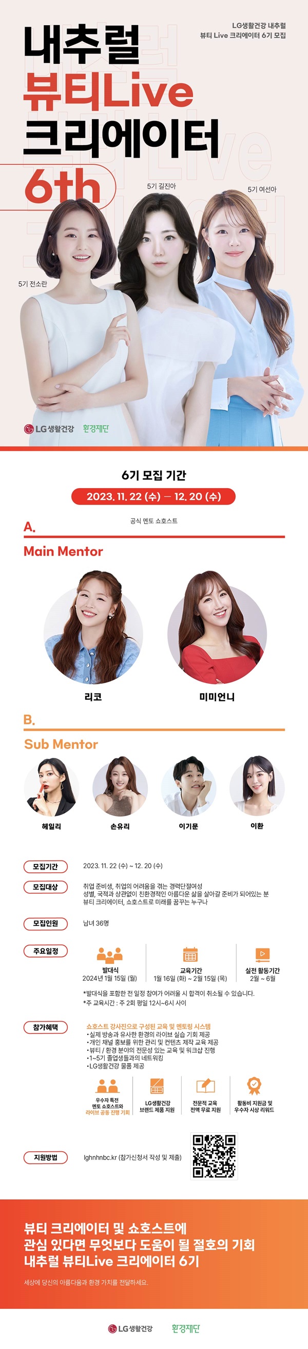 | 혜택 | 쇼호스트 강사진으로 구성된 교육 및 멘토링 시스템 및 활동비 지원금 및 우수자 시상 리워드 外 |