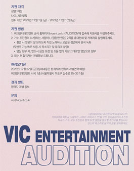 - 현장오디션 : 2023년 12월 22일 (금) * 비크엔터테인먼트 사옥 1층