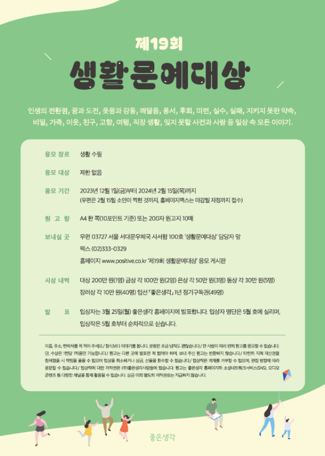 - 우편 : 03727 서울 서대문우체국 100호 '생활문예대상' 담당자 앞