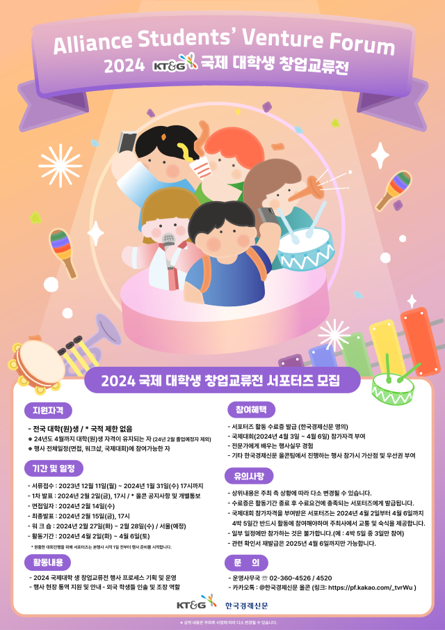 - 한국경제신문에서 ‘2024 KT&G 국제대학생 창업교류전(ASVF)을 함께 운영할 서포터즈를 모집합니다.
