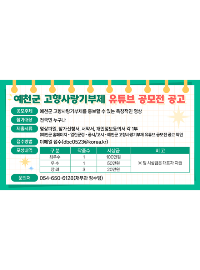 - 예천군에서 고향사랑기부제 유튜브 공모전을 개최하오니