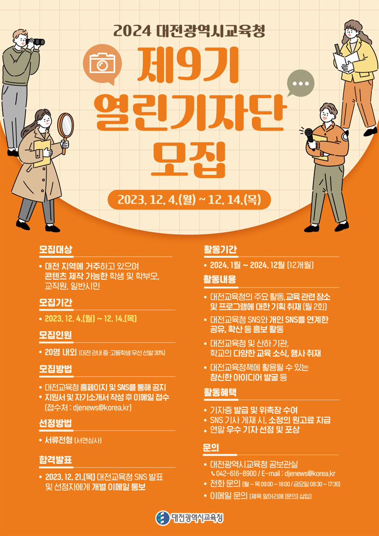 - 2024 대전광역시교육청 제9기 열린기자단을 모집하오니