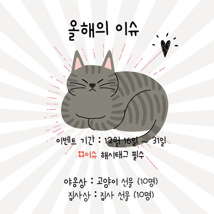 | 시상내역 | 야옹상 : 고양이 선물 (10명), 집사상 : 집사 선물 (10명) |