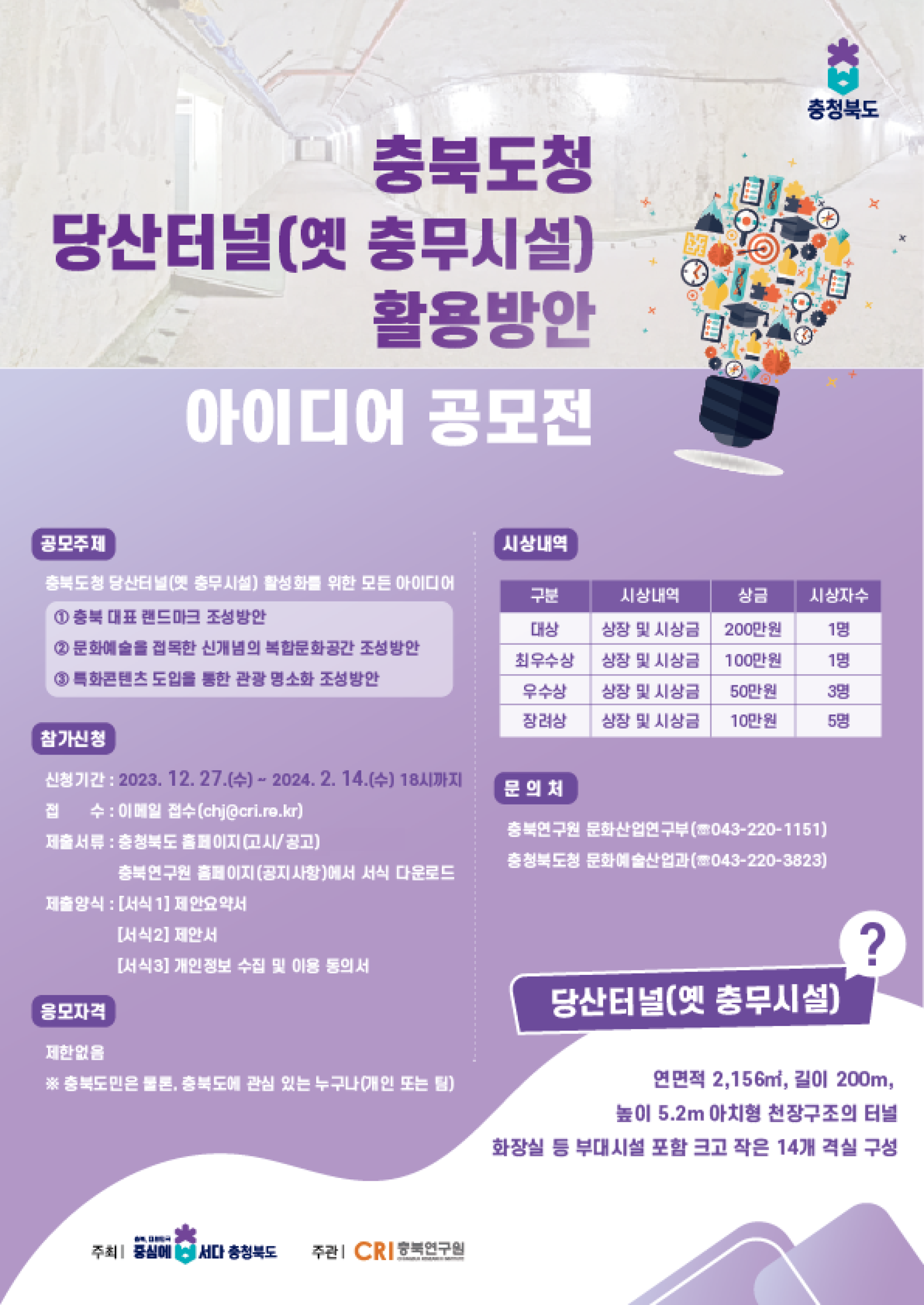 - 충북도청에서 당산터널(옛 충무시설) 활용방안 아이디어를 공모하오니