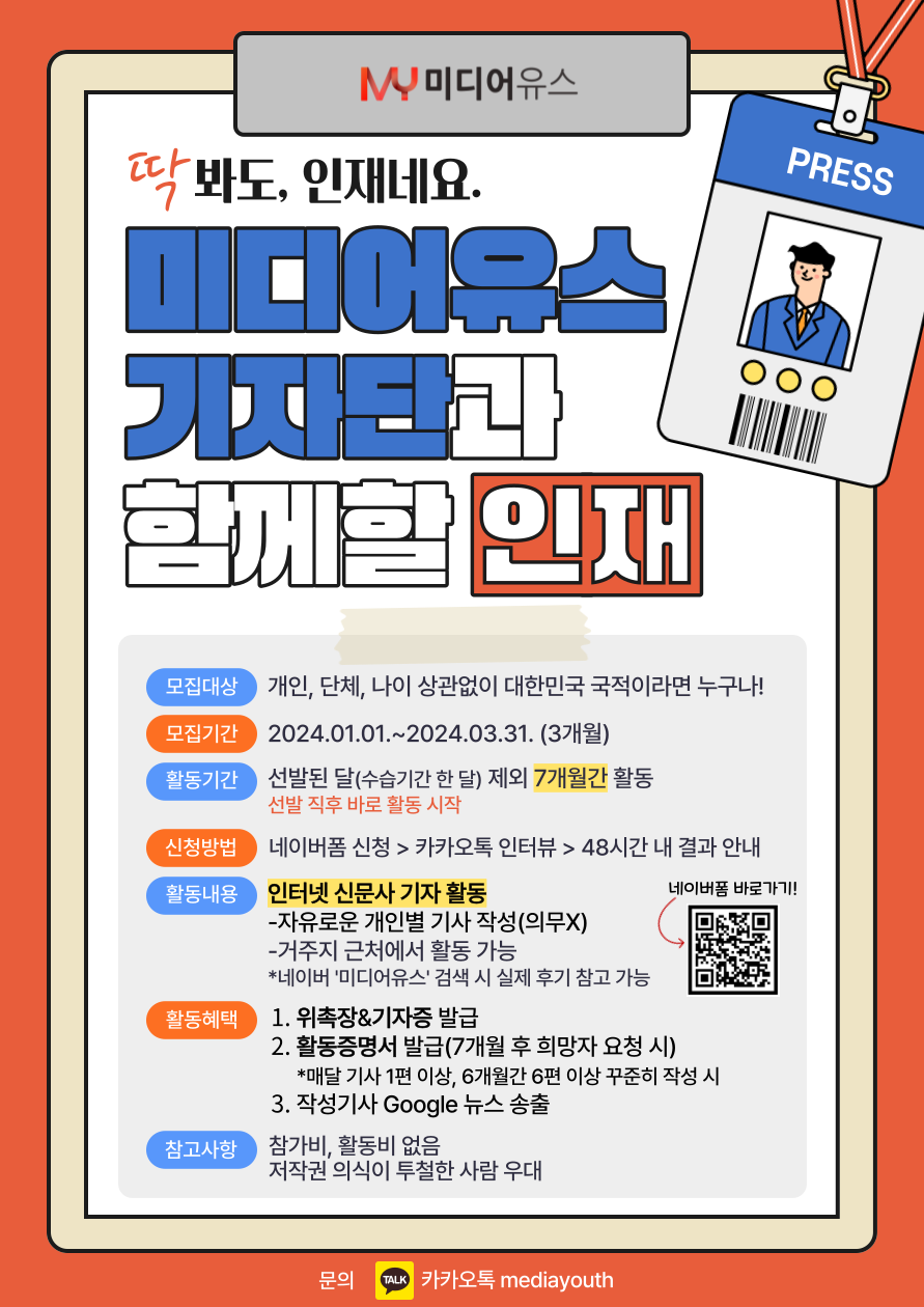 - 미디어유스에서 2024년 1분기부터 함께할 기자단을 모집합니다!