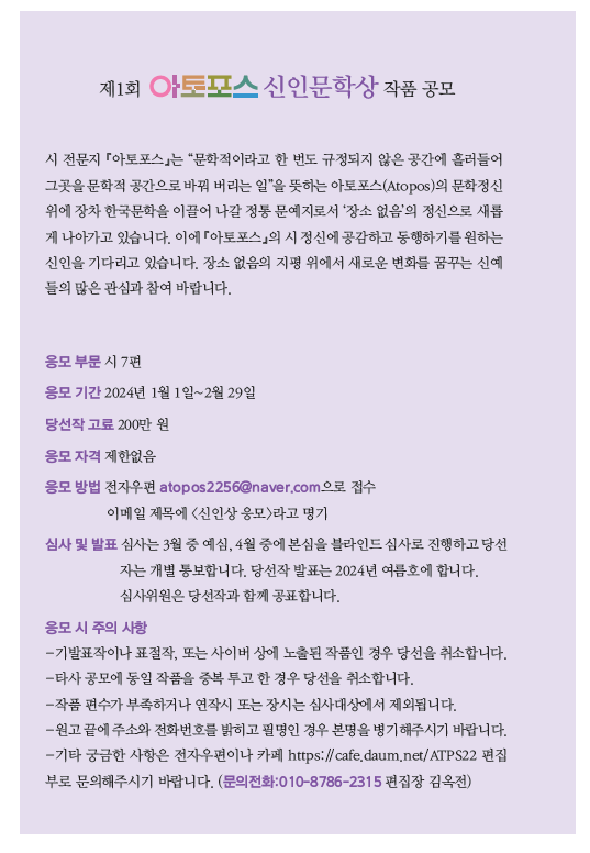 이에 《아토포스》의 시 정신에 공감하고 동행하기를 원하는 신인을