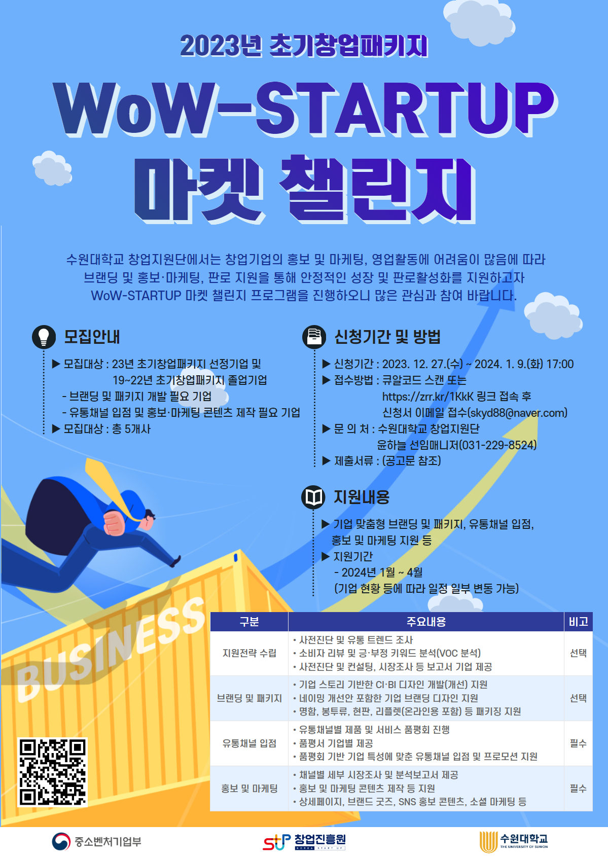 - 수원대학교 창업지원단에서는 창업기업의 홍보 및 마케팅, 영업활동에
