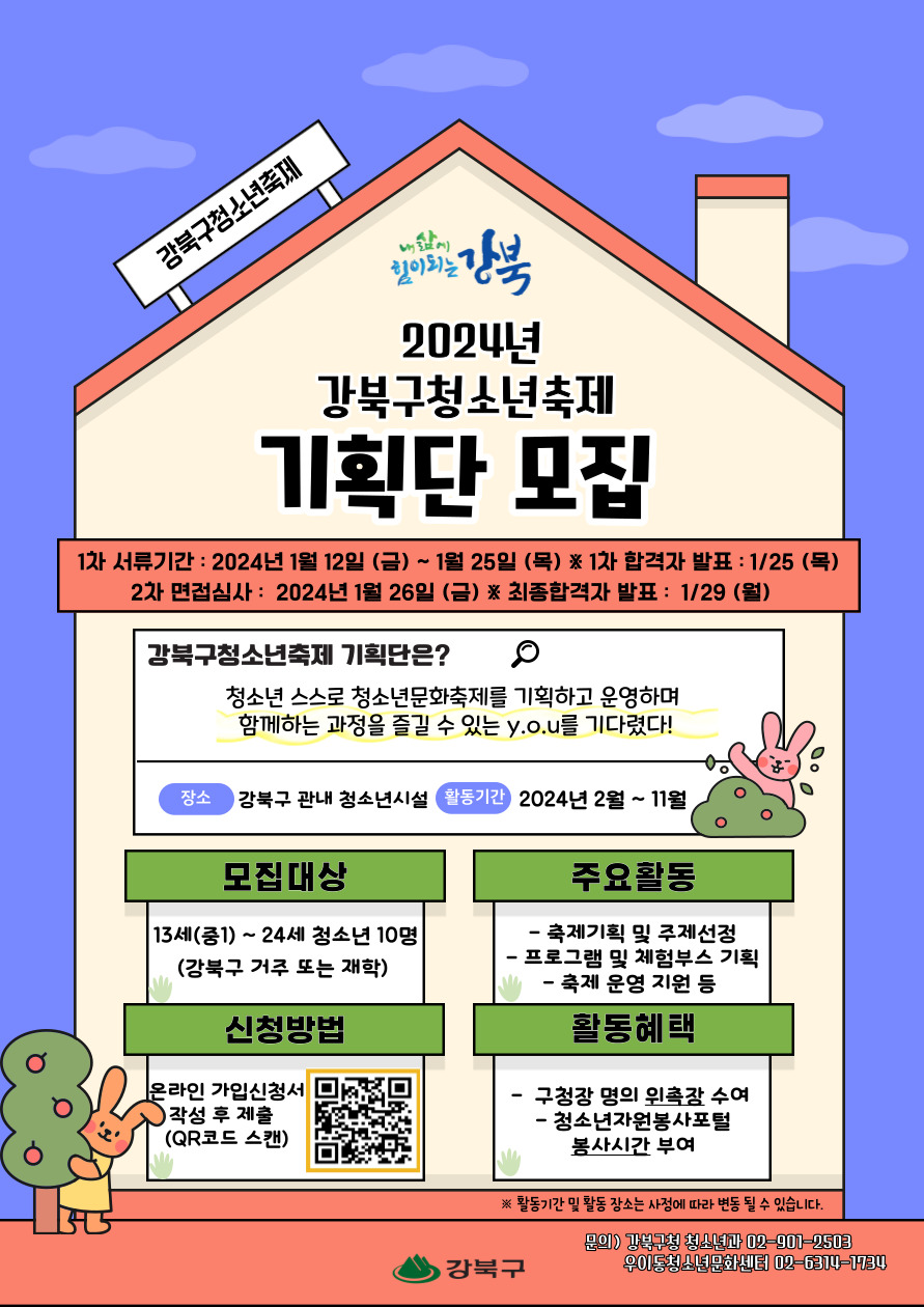 - 강북구청소년축제기획단은 청소년 스스로 청소년문화축제를 기획하고 운영합니다.