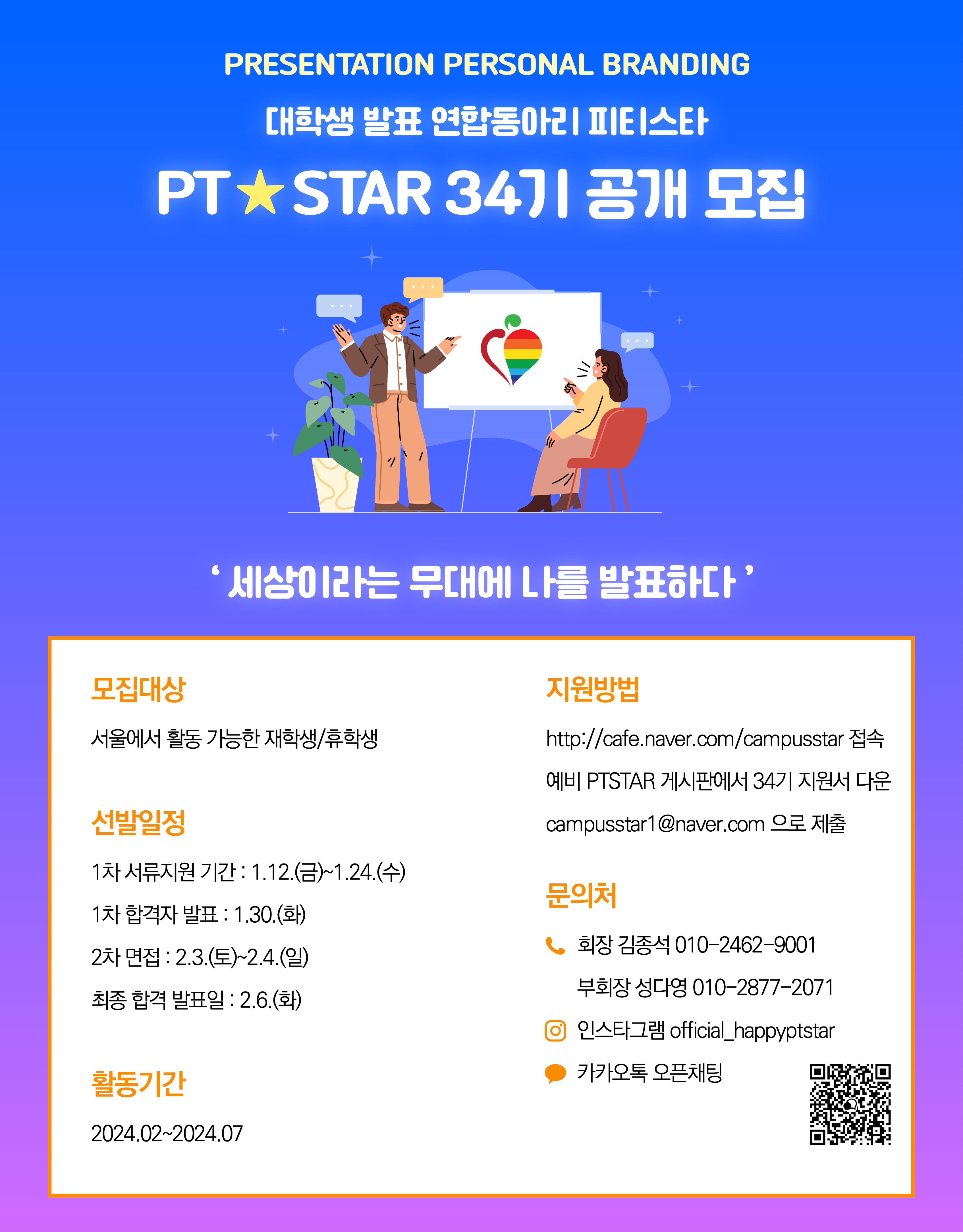 - 대학생연합발표동아리 피티스타 34기를 모집합니다.