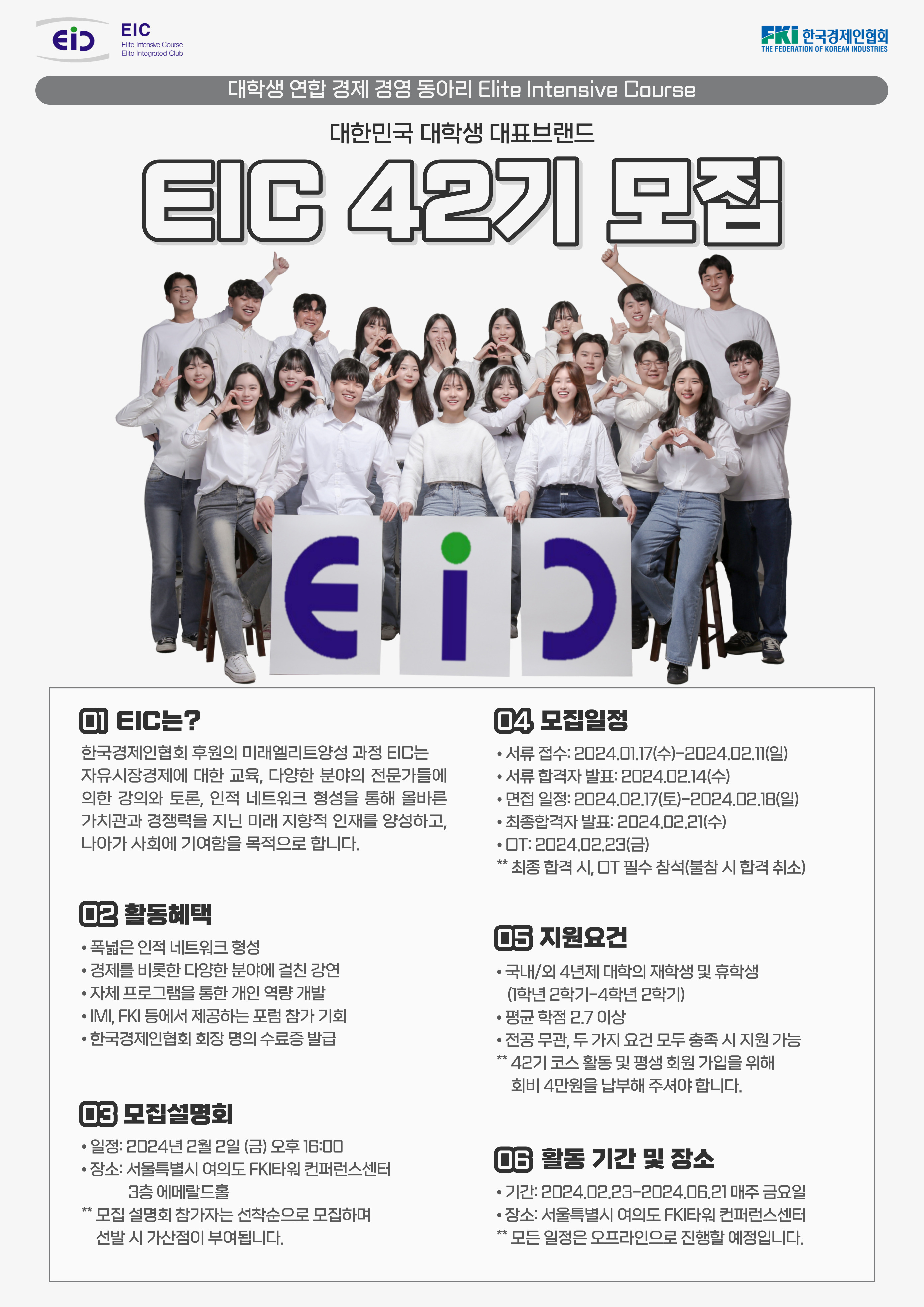 | 혜택 | 한국경제인협회 후원 대학생 연합 경제경영동아리 EIC 42기 수료증 발급, 이외 참여한 서포터즈 수료증 발급, 다양한 경제인과 교수 강의, 경제 교육 커리큘럼 제공, 수료 후 EIC 정회원 등록과 정회원 혜택 제공 |